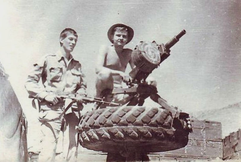 Мобілізовані військовослужбовці строкової служби Радянської армії, рядові Дмитро Полярний та Андрій Ватаґін чергують навиносному посту сторожової застави батареї артрозвідки 1074-го артилерійського полку. 1988 рік, Кабул (столиця Афганістану). Для забезпечення кругової оборони виносного посту застосовується ноу-хау - до вкопаного у ґрунт заднього мосту автомобіля ГАЗ-66 дротом прикручено автоматичний станковий гранатомет АГС-17. Вогнева позиція обкладена ящиками від боєприпасів - вочевидь, з піском. Фото: Kalabaha1969, en.wikipedia.org